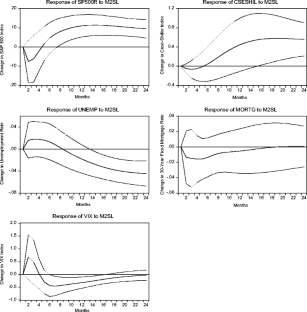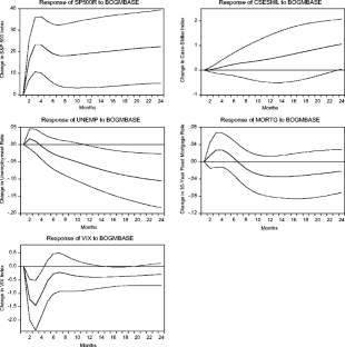 The impulse response functions were generally stable with respect to the Cholesky ordering of the variables. The directions of change in response to the monetary base were the same for all orderings. The significance was generally preserved with equities being significant in all orderings, housing values approaching significance only at the end of the period. Unemployment sometimes reached significance slightly earlier or later. VIX was always significant early and sometimes marginally regained that significance during the second year. Mortgage rates had the expected direction but only flirted with significance late in the forecast. Extending the sample back to January of 2008 gives the same pattern for all variables though the housing market’s response becomes significant in month 19 and the mortgage rate is marginally significant from months 11 to 14.