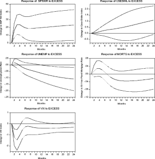 An argument can be made that the crisis began earlier in the year as during that period the Fed took some preliminary actions including lowering the federal funds rate, and the subprime market was in distress. Extending the sample to January of 2008 leads to the same pattern of impulse responses. However, the sup Wald statistic (Quandt Likelihood Ratio) identified September of that year as the optimal structural break. (See Canova 2007, p 116 for a discussion of this technique in the VAR context.) The same technique found no more breaks within the “trimmed” post 2008 period.