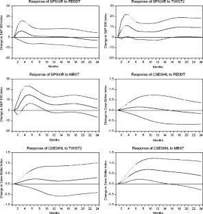 The Schwarz Information Criterion(SIC) and Hannan-Quinn (HQ) lag length selection criteria suggest a lag of two months. The Akaike Information Criterion (AIC) recommends a lag of three months, but the AIC is known for overestimating lag length (for example, see Kapetanios (2001)). Given the small n, the more parsimonious model suggested by SIC and HQ is chosen. Using a longer lag structure leaves the pattern of the results intact. The VAR stability condition is met with the inverse roots of the characteristic equation all within the unit circle. (Note that these are inverse roots.) VAR stability implies stationarity. See Lütkepohl (2013, p 19–21) for a full description of this test.