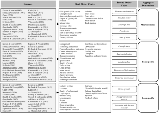 Table 4 reviews the type of NPL analyzed in each reference by either ‘aggregate’ or ‘disaggregate’ type of NPL. Disaggregate NPL are then categorized according to real estate, corporate, and consumer loans. Further, the table lists each regional origin of the investigated datasets.