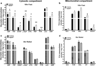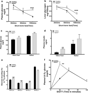Bar graphs illustrating stable isotope [U-13C6]-glucose (M+6) infusion studies a) represents hepatic glucose production calculated using isotope infusion rate and final M+6 glucose enrichments and is expressed as mg/kg/min. b) represents ‘F’ - sum of fraction mass isotopomers (M1/∑m+M2/∑m+M3/∑m) that recycled from the infused isotope [U-13C6]-glucose and contributed to Cori cycling. Data are mean ± SEM. ** represents p<0.001 using Students T test comparisons for 18hr fast Iqgap2 -/- and control mice. Supplementary material 3 (JPEG 478 kb)