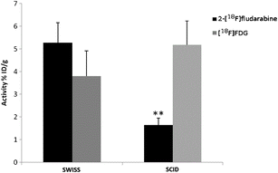 Preclinical studies were conducted with 2-[18F]fludarabine, in parallel with 2-deoxy-2-[18F]fluoro-d-glucose ([18F]FDG), in Swiss CD-1 and CB17 severely combined immunodeficient (SCID) mice, both as tumor-free control groups, and SCID mice bearing RL lymphomas.