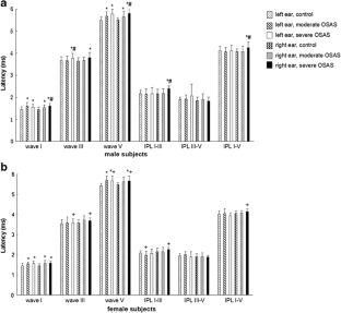 Prolonged latencies of waves I, III, and V were observed in OSAS patients. They were significantly correlated with apnea hypopnea index, arousal index, and hypoxia-related parameters. Compared to female patients, male patients had longer latencies of waves III and V. For severe male OSAS patients, BAEP of right ear showed additional prolongations of IPLs of I–III and I–V than that of left ear, and the IPL of I–III was correlated with the severity of hypoxia.