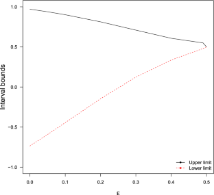We here give further numerical illustrations of the bounds. Since there is a bijection between \(2 \times 2\) tables and the dichotomization of standard normal distributions with free correlations and free thresholds \(\tau _0, \tau _1\), we generate \(2 \times 2\) tables from proportions of a normal latent variable with varying correlations and chosen threshold parameters. For each table, we compute the bounds from Proposition 1 with standard normal marginals, as well as the bound from Proposition 2. Recall that the bound from Proposition 2 is actually the bound from Proposition 1 with uniform marginals. The lengths of the resulting intervals are shown in Figs. 4 and 5. Full computational details are given in the accompanying R scripts. In Fig. 4, we have \(\tau _1 = \tau _2 = 0\), which is a best case scenario. Figure 5 shows a more typical situation, where the length of all bounds are close to the maximal length of such an interval, namely 2. Figure 5 incidentally also illustrates that the bound for the Pearson correlation with standard normal marginals does not always contain the bound for Spearman’s rho. In both Fig. 4 and Fig. 5, points close or at the endpoints \(\rho = \pm 1\) are not included, as different numerical techniques are needed in this region, as done in an attached R file found in the online supplementary material. It is here found that minimum lengths are attained at \(\rho = \pm 1\) and \(\tau _1 = \tau _2 = 0\), with a length of 0.67 for normal marginals and 0.5 for uniform marginals. In our analysis, we use the R (2020) packages copula (Yan and Others 2007), cubature (Narasimhan, Johnson, Hahn, Bouvier, and Kiêu 2020), and copBasic (Asquith 2020).
