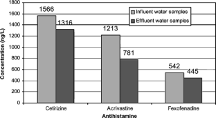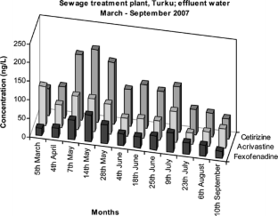 Cetirizine, acrivastine and fexofenadine were detected in both influent and effluent wastewater samples at concentration levels ranging from about 80 to 220 ng/L, while loratadine, desloratadine and ebastine could not be detected in any samples. During sewage treatment, the concentration of the antihistamines dropped by an average of 16–36%. Furthermore, elevated concentrations of antihistamines were observed in samples collected during the season of most intensive plant pollen production, i.e. in May. In the river water samples, the relative pattern of occurrence of cetirizine, acrivastine and fexofenadine was similar to that in the wastewater samples; although the concentration of the compounds was substantially lower (4–11 ng/L). The highest concentrations of the studied drugs were observed near the discharging point of the sewage treatment plant.