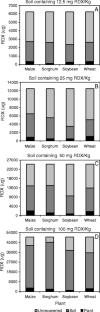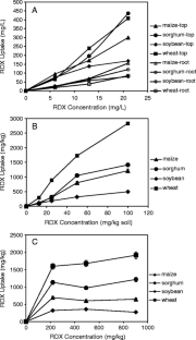 The potential RDX contamination of food chain from polluted soil is a significant concern in regards to both human health and environment. Using a hydroponic system and selected soils spiked with RDX, this study disclosed that four crop plant species maize (Zea mays), sorghum (Sorghum sudanese), wheat (Triticum aestivum), and soybean (Glycine max) were capable of RDX uptake with more in aerial parts than roots. The accumulation of RDX in the plant tissue is concentration-dependent up to 21 mg RDX/L solution or 100 mg RDX/kg soil but not proportionally at higher RDX levels from 220 to 903 mg/kg soil. While wheat plant tissue harbored the highest RDX concentration of 2,800 μg per gram dry biomass, maize was able to remove a maximum of 3,267 μg RDX from soil per pot by five 4-week plants at 100 mg/kg of soil. Although RDX is toxic to plants, maize, sorghum, and wheat showed reasonable growth in the presence of the chemical, whereas soybeans were more sensitive to RDX. Results of this study facilitate assessment of the potential invasion of food chain by RDX-contaminated soils.