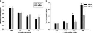 Qian H, Peng X, Han X, Ren J, Sun L, Fu Z (2013) Comparison of the toxicity of silver nanoparticles and silver ions on the growth of terrestrial plant model Arabidopsis thaliana. J Environ Sci 25:1947–1956