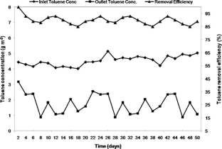 In the present study, a new biofiltration system involving a selective microbial strain isolated from aerated municipal sewage water attached with coir as packing material was developed for toluene degradation. The selected fungal isolate was identified as Trichoderma asperellum by 16S ribosomal RNA (16S rRNA) sequencing method, and pylogenetic tree was constructed using BLASTn search. Effect of various factors on growth and toluene degradation by newly isolated T. asperellum was studied in batch studies, and the optimum conditions were found to be pH 7.0, temperature 30 °C, and initial toluene concentration 1.5 (v/v)%. Continuous removal of gaseous toluene was monitored in upflow packed bed reactor (UFPBR) using T. asperellum. Effect of various parameters like column height, flow rate, and the inlet toluene concentration were studied to evaluate the performance of the biofilter. The maximum elimination capacity (257 g m−3 h−1) was obtained with the packing height of 100 cm with the empty bed residence time of 5 min. Under these optimum conditions, the T. asperellum showed better toluene removal efficiency. Kinetic models have been developed for toluene degradation by T. asperellum using macrokinetic approach of the plug flow model incorporated with Monod model.