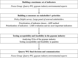This study aims to establish a common Key Performance Indicators (KPIs) framework for reporting about the gypsum industry biodiversity at the European level. In order to integrate different opinions and to reach a consensus framework, an original participatory process approach has been developed among different stakeholder groups: Eurogypsum, European and regional authorities, university scientists, consulting offices, European and regional associations for the conservation of nature, and the extractive industry. The strategy is developed around four main steps: (1) building of a maximum set of indicators to be submitted to stakeholders based on the literature (Focus Group method); (2) evaluating the consensus about indicators through a policy Delphi survey aiming at the prioritization of indicator classes using the Analytic Hierarchy Process method (AHP) and of individual indicators; (3) testing acceptability and feasibility through analysis of Environmental Impact Assessments (EIAs) and visits to three European quarries; (4) Eurogypsum final decision and communication. The resulting framework contains a set of 11 indicators considered the most suitable for all the stakeholders. Our KPIs respond to European legislation and strategies for biodiversity. The framework aims at improving sustainability in quarries and at helping to manage biodiversity as well as to allow the creation of coherent reporting systems. The final goal is to allow for the definition of the actual biodiversity status of gypsum quarries and allow for enhancing it. The framework is adaptable to the local context of each gypsum quarry.