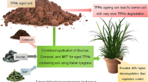The addition of biochar (treatment B) did not increase the effectiveness of TPH removal (Fig. 1), which is consistent with a previous study (Carcia-Delgado et al. 2015). Biochar contains many pores that may affect its function in the soil, e.g., smaller pores may influence molecule adsorption and transport, while larger pores are significant for water-holding capacity and aeration of soil. In essence, biochar contains a greater surface area because its pores have a far larger concentration than soil (Quilliam et al. 2013a). The porous physical properties of biochar provide an important habitat niche for microorganisms, which may be the most common explanation for why biochar can increase the abundance and activity of soil microorganisms (Pietikäinen et al. 2000). However, its contribution is small (Quilliam et al. 2013a). Studies have shown that biochar barely affects the composition of the soil microbial community (Steinbeiss et al. 2009). Our study has shown that after burial in the soil for 3 months, despite the significant reduction in the number of microorganisms compared to the plant treatment, biochar had no significant impact on other treatments. This was less likely to be due to surface area and pore volume in our study. Biochar could also affect soil properties, e.g., significantly increased soil pH and soil C, increased sub-nanopore surface area, reduced soil bulk density, and so on (Mukherjee et al. 2014). However, relative to the soil, the contribution of biochar is very low in the total soil pore space and the total soil surface area. Furthermore, a large proportion of the biochar pores were less than 1 μm in diameter, which is effectively uninhabitable for most microbes. Biochar has a lower available C status and differs in the structure of the microbial community relative to the surrounding soil. At least in the short term, biochar cannot provide a meaningful habitat for microbes (Quilliam et al. 2013a). One reason may be that biochar often introduces high concentrations of mineral salts and PAHs, which can have a negative impact on the microbial colony (Boonchan et al. 2000).