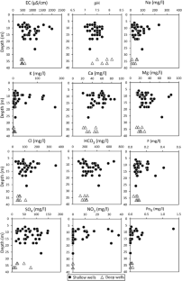 Groundwater samples were collected from 44 wells in the Ramganga Sub-Basin (RSB), India, and analysed for major ions, nutrients and trace metals. The primary goal of this study is to evaluate the hydrochemistry and to identify the geochemical processes that govern the water chemistry in the shallow and deep tube wells in the study area using geochemical methods. The knowledge of changes in hydrochemistry of the aquifers is important for both groundwater recharge and use in the region. This study found that there are substantial differences of water chemistry between shallow and deep wells. In the shallow wells, the average concentrations of total dissolved solid (TDS), Na, K, Ca, Mg, HCO3, Cl, SO4, NO3, PO4, F, Cu, Mn, Fe and Cr are twofold higher than the deep wells. The concentrations of dissolved silica in the groundwater do not vary with the depth, which implies that the variation in the water chemistry is not due to mineral dissolution alone. Major ion ratios and saturation indices suggest that the water chemistry is predominantly controlled by dissolution of carbonate minerals, silicate weathering and ion exchange reactions. Thermodynamic evaluation (ion activity ratios and stability filed diagrams) indicates that the kaolinite and gibbsite controlled the water chemistry in the both shallow and deep wells. In addition, the groundwater chemistry in the shallow wells is affected by the vertical infiltration of contaminated water from surface contamination sources and nitrification process. In the deep wells, absence of NO3 and low concentrations of Cl, SO4, PO4 and F imply the role of regional flow and denitrification in the groundwater. Results concluded that proper management plan is necessary to protect the shallow aquifer in the RSB since shallow aquifer pumping is less expensive than the deeper one.