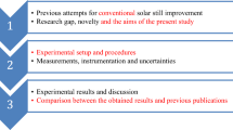 Ketabchi F, Gorjian S, Sabzehparvar S, Shadram Z (2019) Experimental performance evaluation of a modified solar still integrated with a cooling system and external flat-plate reflectors. 187:137–146. https://doi.org/10.1016/j.solener.2019.05.032