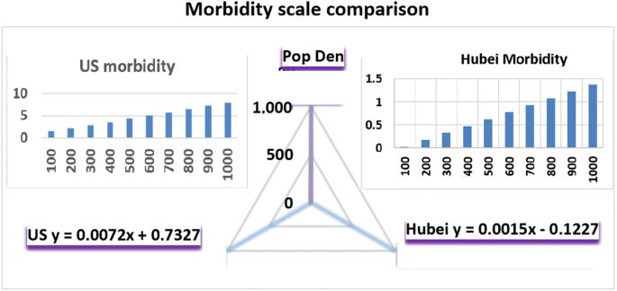 By analyses of the data from the Hubei province in China and 53 major US cities in the US states and territories, we obtained the positive correlations between the population density and the disease morbidity. We next asked whether there is a difference between these two data sets of cities on the impact of the disease epidemic. We calculated the morbidity of population density from 100 from 1000 using the linear formula obtained from the Hubei and major cities of the US states and territories. Although both data sets have positive correlation between the population density and morbidity, they are not at the same degree (Table 1). Based on the formula derived from Hubei province, the morbidity increased from 0.177 to 1.377 when the population density increased from the 100 to the 1000 (Fig. 4a). On the other hand, in major cities and territories of the USA, the morbidities increased from 1.453 to 7.93 when the population density increased from the 100 to the 1000 (Fig. 4b). The increases in rates between these two sets of data are significantly different (Fig. 4c).