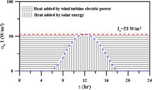 One of most reduction reasons of simple conventional solar still productivity is the coupling between high solar intensity and the high ambient temperature in the same time. The high intensity increases the saline water temperature, while the outside temperature increases the glass temperature, and consequently reduction in saline water and glass temperature difference leads to reduction in condensation and productivity. The present theoretical study focuses on the completion of the absorbed solar energy in the basin to be constant during the day. The basin water will be in high temperature level all day especially at the time of low outside temperature far away the noon. The absorbed heat in the basin is held constant at αw Imax by extra heat from wind turbine power with battery storage system all day hours. The results show that the solar still productivity with constant heat supply is more than that with same amount of variable energy during sun rise time only (6 AM to 6 PM) by 69.133%. So, constant absorbed heat in the water basin (αw Imax) through the 24 h of the day enhances the performance with productivity up to 248% with the hybrid solar and electric power consumption of the wind turbine power. The water in the basin is held constant at 2 cm via makeup water to compensate the evaporation rate.