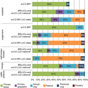 A total of 566 new datasets were integrated into ecoinvent version 3.6, allowing the incorporation of LUC in Brazilian products in state, regional and national level. GHG emissions reduced, being 42.2% and 99.9% lower to soybean and sugarcane than in ecoinvent v3.5. Four improvements were the main causes: (i) state-level LUC modelling with national official data; (ii) regionalizing carbon stocks; (iii) including pasture and forestry land use categories; (iv) and considering sugarcane as a perennial crop. The way to calculate national-level results based on subnational data was an important source of difference in emissions too. Uncertainties specifically associated with land use substitution patterns were not incorporated, and they can potentially have impacts as large as the uncertainties of all the remaining processes combined.