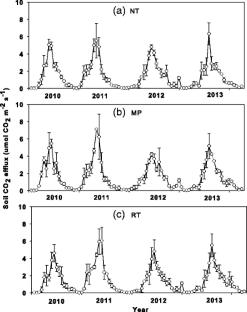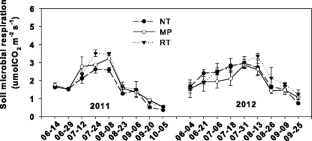 In this study, the effects of 10 years of conservation tillage (no-till: NT and ridge tillage: RT) on soil CO2 fluxes and soil microbial communities were assessed in a black soil in Northeast China.