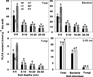 The annual soil CO2 emissions were higher under moldboard plow (MP) than under NT by 7.8 % (P < 0.05). The average soil microbial respiration rate from RT was higher than that from MP by 11 % (P < 0.05). Soil microbial respiration under NT (65 %) and RT (64 %) contributed more to soil CO2 emissions than MP (54 %). Total soil bacterial and fungal phospholipid fatty acids (PLFAs) were 1.6 times and 2.6 times greater under NT and RT, respectively, than under MP in the 0–5 cm layer, whereas they decreased by 21–47 % under NT and 26–41 % under RT in the 5–10, 10–20, and 20–30 cm layers. The F:B (the ratio of soil fungal PLFAs to bacterial PLFAs) varied with soil depth (0–10 cm) between conservation tillage (NT and RT) and MP. Conservation tillage induced the stratification of the soil microbial community on the vertical profile.