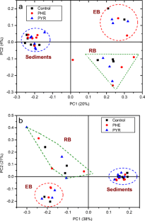 The diversity and community structure of EB and RB were more sensitive to PHE and PYR contamination as compared to those in the sediments. All samples were strongly clustered according to EB, RB, and sediments, suggesting the niche-specific influence of PAHs on bacterial communities. Potential PAH-degrading bacteria (Pseudomonas sp., Paenibacillus sp., and Flavobacterium sp.) in EB and RB were stimulated by PAH contamination. The results revealed an increase prevalence of specific bacteria which may be responsible for PAH degradation. PHE contamination increased the abundance of Proteobacteria in EB but decreased the number of Firmicutes, Bacteroidetes, and Chloroflexi. The numbers of Proteobacteria and Firmicutes in EB were enhanced by PYR treatment. However, both PHE and PYR treatment showed similar effects on the bacterial communities in RB.