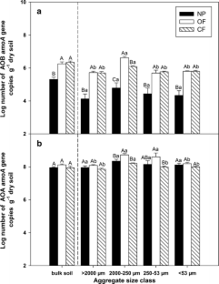 Soil samples were collected from plots of three types of land use, i.e., native pasture (NP), conventional farming (CF), and organic farming (OF). Soil aggregates were separated using wet-sieving method. The abundance and structure of AOB and AOA communities were assessed by qPCR and DGGE, respectively.