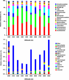In total, 30 soil samples from the mountain at 10 sampling elevational zones (every 100 m from the baseband to the summit) were collected. High-throughput pyrosequencing approach was performed of soil bacterial 16S rRNA targeting V3 + V4 region by MiSeq PE300 and taxonomically classified based on Silva database. Bacterial community composition and diversity patterns were detected, and bacterial data were correlated with environmental factors to determine which factors influenced bacterial community composition.