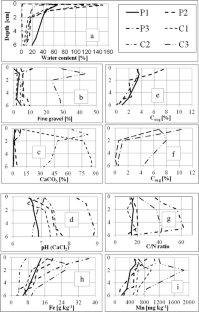 Value and chroma of moist soil color and organic carbon (OC) content indicated the formation of an Ah horizon in the gaps. A distinct accumulation of very fine sand (2–6 %), silt (11–20 %), OC (2–10 %), Fe (0.6–3.4 %), and Mn ( 350–1700 mg kg−1) occurred in a matrix from mainly coarse and medium sand. The pH was neutral to alkaline (pH 6.6–8.9). Slabs and cobbles, and the sand beneath them, stayed unchanged. The narrow C/N ratio of the soil in the pavement gaps indicated, under open air, an origin of accumulated fine material from other soils and surrounding vegetation. In contrast, the soil example of an underpass had a wide C/N ratio that indicated an origin of fine material from traffic.