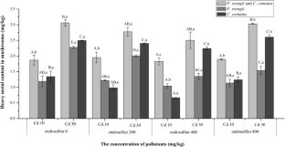 The subjects of this study were to investigate the remediating potential of the co-cultivation of Pleurotus eryngii and Coprinus comatus on soil that is co-contaminated with heavy metal (cadmium (Cd)) and organic pollutant (endosulfan), and the effects of the co-cultivated mushrooms on soil biochemical indicators, such as laccase enzyme activity and bacterial counts.