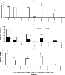 Using phytoremediation (Panicum maximum) (G), vermiremediation (Pontoscolex corethrurus) (E), and bioaugmentation (encapsulated bacterial consortium) (B), individually and in combination, in contaminated soil by oil (PS) with sterilized (St) and non-sterilized treatments. Grass and earthworm biomass and the number of cocoons were determined after 112 days.