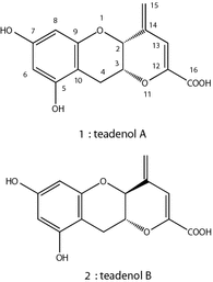 Two new phenolic compounds, teadenol A (1) and teadenol B (2), were isolated from tea (Camellia sinensis L.) leaves fermented with Aspergillus sp. (PK-1, FARM AP-21280). The chemical structures of 1 and 2 were elucidated based on the analyses of their spectroscopic data. The absolute configurations of the structures of 1 and 2 were also certified by their biosynthetic preparation in the treatment of tea catechins with Aspergillus sp.