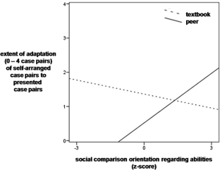 This experimental study extends conflict elaboration theory (1) by revealing social influence dynamics for a knowledge-rich computer-supported socio-cognitive conflict task not investigated in the context of this theory before and (2) by showing the impact of individual differences in social comparison orientation. Students in two conditions (N = 59) compared their self-created task solution with a partly correct solution presented additionally, deviating from their solution. The other solution’s source was introduced either as a low status source (“peer”) or as a high status source (“textbook”) whereas the presented solution was identical. In a baseline condition, this comparison possibility was missing. Students in the textbook condition experienced more socio-cognitive conflict and adapted their solution more often to the correct aspect of the presented solution than students in the peer condition. Students low in social comparison orientation adapted their solution more extensively in the textbook condition than in the peer condition.