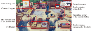 Collaborative learning helps to construct a learning situation in which students solve problems together, and their learning effectiveness is promoted. However, collaborative learning often has the problem of unequal participation of learners. Therefore, this study combines the collaborative learning mode of the virtual environment of digital games and applies it to an elementary school art course, in the hope of solving the problems in collaborative learning. Using a quasi-experimental research design, students were divided into a virtual group and a real group to compare whether the different styles of collaborative learning would affect their learning. Participants in this study were 83 fourth-grade students from an elementary school. This study found that the learning effectiveness and motivation of the students in the virtual group were significantly higher than those of the students in the real group. The reason is that the virtual group learned in an active virtual environment in which the students’ shared solutions with their partners, and could even manipulate their virtual avatar to give peer guidance, triggering learning motivation to promote inter-group interaction. However, students in the real group were worried about making the classroom dirty, and had to invest more effort. They gave priority to their favorite specific colors, and completed the mixed-color questions independently, with less collaboration and communication, making it difficult for them to correctly answer the questions that their peers solved independently during the learning process. It is suggested that virtual avatars can be introduced in actual teaching to improve student interaction and attention.