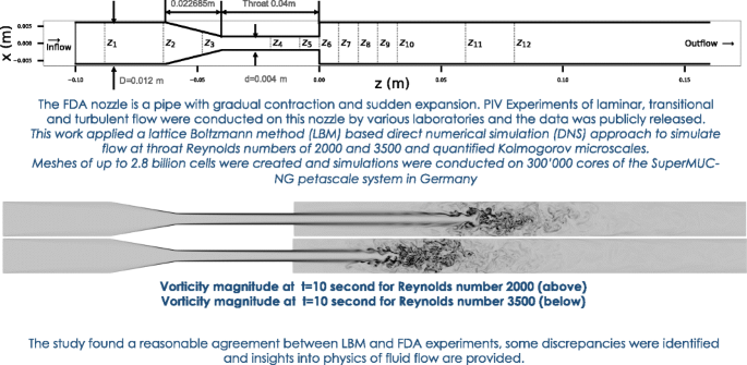 Simulations were conducted with three different spatial and temporal resolutions in order to explore the capabilities of an off the shelf LBM on a desktop machine to a federal supercomputer. Based on previous observations on resolution requirements in LBM simulations of transitional flow [14], a spatial resolution of about 80μm was predicted as a minimum requirement for simulation of Reth = 2000 and accurate analysis of flow characteristics thereof. This resolution resulted in \(\sim 45\) million lattice sites representing fluid inside the nozzle and 50 lattice cells across the height of the nozzle throat. This is referred to as normal resolution (NR) hereon. For Reth = 3500 however, the flow was expected to transition and a high resolution (HR) of 40μm was thus chosen, which resulted in about 357 million lattice cells. As would be seen in Section 3, HR resolution sufficed for accurate flow simulations for both the Reynolds numbers. To further ensure mesh independence, assess the flow in accordance with Kolmogorov theory, and especially because it was not known whether LBM simulations will transition to turbulence, an additional set of simulations were conducted with an extreme resolution (XR) of 20μm resulting in about 2.88 billion lattice cells in the fluid domain.