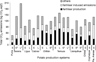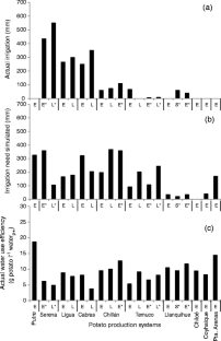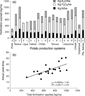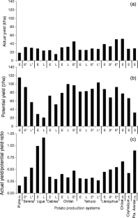 In Chile, potatoes are grown in a wide range of ecological zones and levels of technology resulting in wide ranges of crop management and yields. The aim of the present study was to assess yield gaps, resource use efficiencies and foot-printing in different potato cropping zones between 18 and 53° South considering early and late crops, small and large holdings (>10 ha/year) and ware and seed potato crops. Two mathematical tools were used to generate data for comparisons: the light interception and utilization simulator for potato crops (LINTUL-Potato) to calculate potential yields and water need of each system and the Cool Farm Tool – Potato (CFT) to calculate the amount of CO2 associated with the production of 1 ton of potato. Meteorological data for LINTUL-Potato came from official services, and data needed to complete the CFT came from a survey carried out for the 10 sites yielding amounts of inputs and number of operations, potato yields and planting and harvesting dates. The survey yielded 20 cropping systems with an average yield of 31 t ha−1. Yields were related to daily growth rate and not to the length of the growing season. Considerable variation was found in resource-use efficiency and CO2 emission. It was concluded that large farms show a lower land footprint than small farms due to a higher technological level, but while applying more water and fertilizer, they result in higher water and CO2 footprints. Late crops may fetch higher off-season prices but have higher land, water and CO2 footprints. The most suitable potato production systems are the rain-fed summer crops in the South with the lowest footprints. The highest footprints have the irrigated winter crops in the centre of Chile. The subsistence high altitude Andean crop in the utmost North has the highest land footprint but the lowest CO2 emission. The description, analysis and benchmarking of the potato production systems in Chile allow strategies for improving footprints and profitability and yields information about future investments in research, development and production of the crop.