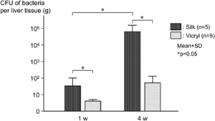 We evaluated the usefulness of synthetic absorbable sutures (Vicryl) in preventing surgical site infection (SSI) after hepatectomy. A rat model of 60% partial hepatectomy was used. Bleeding from the cut surface of the liver was controlled by using two suture types: silk and Vicryl. In the Vicryl group, the lesser omentum was slightly adherent to the cut surface of the liver, while in the silk group, the suture remained, and severe adhesions were found. The number of Staphylococcus aureus was significantly larger in the silk group. We compared a group of patients (n = 125) who underwent hepatectomy using silk with one (n = 188) using Vicryl. The respective incidences of SSI and infection on the cut surface of the liver in the Vicryl group (3.2, 1.6%) were significantly lower than in the silk group (11.2, 8.8%). In accordance with the results of multivariate analysis, duration of operation, use of silk sutures and the complication of bile leakage were selected as independent factors. The risk of SSI in the silk group was 3.4 times that in the Vicryl group. The use of synthetic absorbable sutures, instead of silk sutures, in all the procedures of hepatectomy contributed significantly to the prevention of SSI.