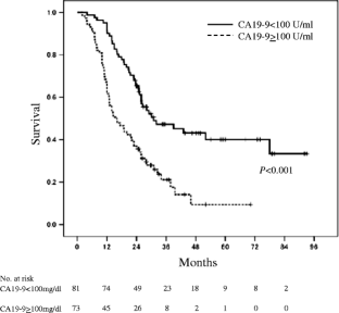 On ROC curve analysis, the cutoff value of CA19-9 was determined to be 100 U/ml. Of 73 patients with CA19-9 value ≥ 100 U/ml, 39 (53 %) had early recurrence. In contrast, only 9 of 81 patients (11 %) with CA19-9 value < 100 U/ml developed a recurrence at an early period (p < 0.001). Multivariate analysis revealed that CA19-9 value ≥ 100 U/ml (odds ratio, 11.2) were significant predictors of early recurrence. The overall 3- and 5-year survival rates and median survival times were 47.3 %, 40.1 %, and 31 months in patients with CA19-9 value < 100 U/ml and 21.2 %, 9.4 %, and 16 months in patients with CA19-9 value ≥ 100 U/ml (p < 0.001).