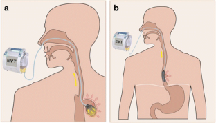 For example, a 55-year-old developed a coagulative necrosis after ingestion of an alkaline solution. After 1 week of conservative treatment, the patient was experiencing increasing dysphagia. Endoscopic dilation was performed but led to a large esophageal perforation 23–40 cm from the dental arch. We immediately commenced EVT with extraluminal and intraluminal sponge placement. Up to four sponges were placed at the same time. Following this, the patient underwent ongoing therapy with both esophageal bougienage and the use of intraluminal and extraluminal sponge placement. EVT was continued for 18 days with changes being made at intervals of 3 days. The 17-cm long perforation in a highly infectious environment was successfully healed with EVT.