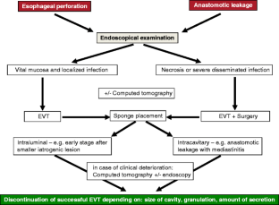 We think that EVT cannot really fail if the indication is right. However, in some cases, therapy has to be extended. In contrast to other published series, we combined EVT with surgery in a relevant proportion of our patients. Nine of 21 (43 %) patients received EVT to control esophageal defects that could not be closed by suture due to extent or late presentation. In these cases, the esophageal wall defect was controlled by an intraluminal sponge whereas the concomitant mediastinitis was dealt with by established surgical concepts. In these cases, the sponge therapy resulted in salvage of the esophagus in seven of nine (78 %) patients. From our experience, EVT and surgery should be seen as complementary procedures. Mediastinitis and pleural empyema were the main indications for operative therapy as inevitable adjunct procedure to sponge therapy in these individual cases. EVT can serve as an isolated therapy or as part of a more complex concept of esophageal salvage combined with conventional surgery for the control of mediastinal or pleural sepsis.