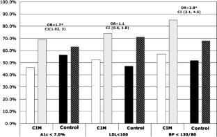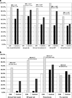 Five hundred and sixty-five patients met inclusion criteria. Patients in the CIM practice experienced a significant increase in completion of care processes compared to control patients for measurement of annual low-density lipoprotein (LDL) cholesterol (OR 3.1, 95% CI 1.7–5.7), urine microalbumin (OR 3.3, 95% CI 2.1–5.5), blood pressure (OR 1.8, 95% CI 1.1–2.8), retinal examination (OR 1.9, 95% CI 1.3–2.7), foot monofilament examination (OR 4.2, 95% CI 3.0–6.1) and administration of pneumococcal vaccination (OR 5.2, 95% CI 3.0–9.3). CIM-exposed patients were also more likely to achieve improvements in clinical outcomes of glycemic and blood pressure control reflected by hemoglobin A1c less than 7.0% (OR 1.7, 95% CI 1.02–3) and blood pressure less than 130/80 (OR 2.8, 95% CI 2.1–4.5) compared to controls.