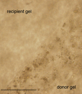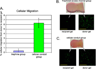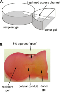 Tears in the avascular portion of the knee meniscus are commonplace and are frequently incapable of healing spontaneously. Delivery of synovial cells from the meniscal periphery to avascular injuries can result in an effective healing response but is difficult to accomplish surgically. This report describes the development of a novel in vitro model comprised of three-dimensionally cultured cells in agarose used to assess the proof of concept that a cellular conduit device could be used to facilitate the delivery of synovial fibroblasts from a cell source to a remote acellular recipient site. The results indicate that synovial fibroblasts are capable of migrating through a cellular conduit more optimally than a created trephined channel over a clinically relevant distance in response to a chemotactic gradient. This model proved to be a reliable way to assess fibroblast-like synoviocyte migration in a clinically relevant fashion for application to avascular meniscal tear healing methodologies, and provided mechanistic information regarding the successful in vivo testing of this specific biomedical device.