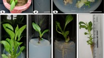 Among the media used, only Gamborg’s B5 medium supplemented with 2.0 mg l−1 Z and 1.0 mg l−1 IBA was able to induce shoot formation (Fig. 1f–g ). The shoot induction period required up to 6 mo, but the number of regenerated shoots was relatively high (>100) once shoot induction was obtained. Shoots were regenerated from three independent calli from hypocotyl explants, taken from different in vitro seedlings. Although shoot-like structures were observed after 4 mo, some shoots seemed stressed (purple-whitish color) and died, but some of them survived and eventually regenerated shoots. The elongation of shoots took 2 mo.