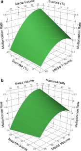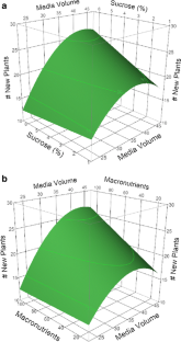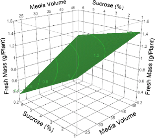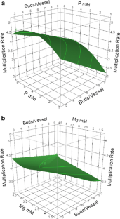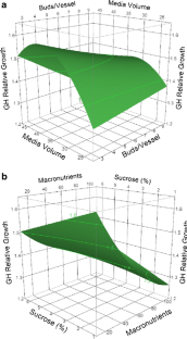 To improve micropropagation and acclimatization of turmeric (Curcuma longa L.), we evaluated the effects of media volume, plant density, macronutrient ion concentrations, cationic ratios [NH4 +]/[K+], and sucrose concentration. Multiplication was highest with low bud density. Yield of new plants was highest with high bud density, the most sucrose, the highest concentration of macronutrients, and the greatest volume of medium. However, maximum plant size required low-density, reduced sucrose and elimination of NH4 +. The largest plants grew quickest during greenhouse acclimatization when macronutrients were lowered to 20 mM. In a follow-up experiment, media volume was set at 40 mL with 5% sucrose with NH4 + reduced to 5 mM, and the effects of varying P, Ca, Mg, KNO3, and bud densities were assessed. The largest plants were produced at low density. More importantly, at high density the optimal concentrations of P, Ca, Mg, and KNO3 predicted plant size that was nearly equal to the maximum value from low-density cultures in the prior experiment. Growth of plants during greenhouse acclimatization was increased by modifications of in vitro medium with plants cultured with 3.32 mM P, 4.5 mM Mg, and 37 mM KNO3 predicted to grow most rapidly. The effect of starter fertilizer in the greenhouse mix was much less than the effects of P, Mg, and KNO3 in vitro. These results showed (1) optimal media formulae for different stages of micropropagation and (2) process-related factors such as plant density and media volume affected the optimal nutrient concentrations.