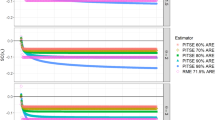 Finally, Figs. A.11–A.18 display the bias and MSE of the estimators of \(\pi \), \(\mu \), \(\sigma ^2\) and \(\alpha \) when \(x_{min}\) is known (\({\hat{\pi }}_K\), \({\hat{\mu }}_K\), \({\hat{\sigma }}_K^2\) and \({\hat{\alpha }}_K\)) and when it is unknown (\({\hat{\pi }}_U\), \({\hat{\mu }}_U\), \({\hat{\sigma }}_U^2\) and \({\hat{\alpha }}_U\)). In terms of bias, the outcomes ar similar: only the absolute value of the bias of \({\hat{\alpha }}\) is slightly smaller in the known-threshold setup. On the other hand, the difference of the MSEs is related to the sample size: when \(n<1000\), the MSE is smaller for all parameters in the known-threshold case, when \(n\ge 5000\) the MSEs are essentially identical. The difference between the two cases when \(n\le 1000\) is larger for \({\hat{\alpha }}\) than for the remaining estimators.