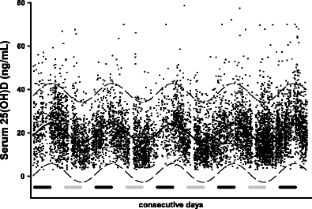 Serum 25(OH)D concentration by age group and month in winter and spring (top panel) or summer and autumn (lower panel). White bars = 0–10 years; gray bars = 11–20 years; rightwards dashed gray bars = 21–40 years; leftwards dashed gray bars = 41–65 years; dotted bars= > 65 years of age (GIF 46 kb)