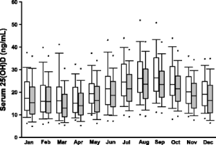 Serum 25(OH)D concentration by month in 8024 subjects without a diagnosis of low bone mass (white bars) and 6028 subjects with a diagnosis of low bone mass (gray bars). The boxes represent the median (25, 75 percentile). The whiskers and small squares below and above represent 10th and 90th percentiles and 5th and 95th percentiles respectively. (GIF 39 kb)