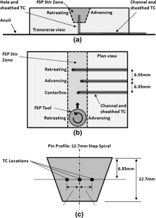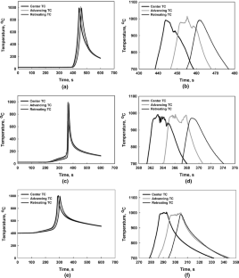 The stir zone (SZ) temperature cycle was measured during the friction stir processing (FSP) of NiAl bronze plates. The FSP was conducted using a tool design with a smooth concave shoulder and a 12.7-mm step-spiral pin. Temperature sensing was accomplished using sheathed thermocouples embedded in the tool path within the plates, while simultaneous optical pyrometry measurements of surface temperatures were also obtained. Peak SZ temperatures were 990 °C to 1015 °C (0.90 to 0.97 T Melt) and were not affected by preheating to 400 °C, although the dwell time above 900 °C was increased by the preheating. Thermocouple data suggested little variation in peak temperature across the SZ, although thermocouples initially located on the advancing sides and at the centerlines of the tool traverses were displaced to the retreating sides, precluding direct assessment of the temperature variation across the SZ. Microstructure-based estimates of local peak SZ temperatures have been made on these and on other similarly processed materials. Altogether, the peak-temperature determinations from these different measurement techniques are in close agreement.