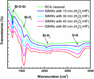 Silicon nanowires (SiNWs) were synthesized by two-step electroless etching of p-type Si (100) wafer and characterized by field emission scanning electron microscopy, UV–Vis spectroscopy, x-ray photoelectron spectroscopy, Fourier transform infrared spectroscopy and Raman spectroscopy. The vibrational signature at 1108 and 2087 cm−1 confirmed SiNWs were passivated by both oxygen and hydrogen atoms. Raman peak at 517 cm−1 indicated crystalline SiNWs with tailing toward redshift due to Fano effect. The Si(2p) and Si(2s) core orbital spectra of SiNWs were found at 99.8 and 150.5 eV, respectively. Moreover, the reflection of SiNWs is minimized to ~ 1 to 5% in the 650-nm wavelength.