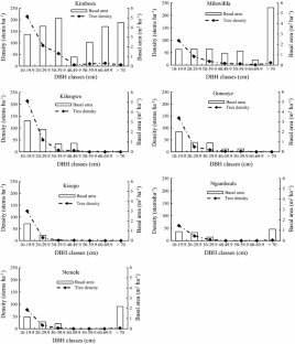 Uluguru forests are globally recognized as important biodiversity hotspots, but anthropogenic pressure threatens their value. This study examined species diversity, abundance, and structure of trees in the Uluguru forests. All trees of diameter at breast height (DBH) ≥ 10 cm were inventoried in seven forests ranging from 3 to 995 ha in area. A total of 900 stems, 101 species and 34 families were inventoried. Fabaceae was the most speciose family. Ehretia amoena Klotzsch was the most abundant species with relative abundance of 9.22 %. The forests differed significantly in species richness (26–93 species ha−1), tree density (85–390 stems ha−1), basal area (3–24 m2 ha−1) and Shannon-Wiener diversity (2.50–4.02). Forest area was significantly and positively correlated with species richness (r = 0.92) and species diversity (r = 0.95). Tree density showed significant positive correlation with species richness (r = 0.80) and basal area (r = 0.85). Milawilila and Nemele forests had highest floristic similarity (0.55) followed by Kimboza and Kilengwe (0.54) while the rest had similarity coefficients of less than 0.50. Despite legislative protection, many forests remain at risk and therefore the possibility to conserve highly valuable tree species via enhanced protection or cultivation must be considered.
