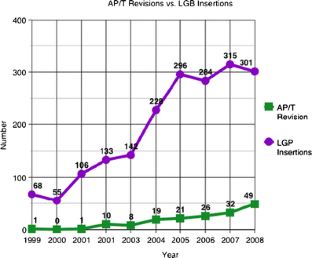 Laparoscopic gastric banding (LGB) is the commonest bariatric procedure in Australia. The commonest complication of LGB is access port or tubing (AP/T) problems, requiring revisional surgery. The aim of this study was to document the evolving pattern of AP/T complications. All patients whose LGB procedure (AllerganTM Bands) and AP/T revision (AllerganTM port revision sets) were performed by one surgeon (1999 to 2008) were included, giving 167 AP/T revisions in 124 patients out of a total 1,928 LGB patients. All patient follow-up details were prospectively recorded and retrospectively analysed. Incidence of LGB AP/T problems was 8.7%. Mean time to first AP/T revision was 2 years. Over the last 4 years of the series, the number of LGB insertions was constant, but the number of AP/T revisions progressively increased. Twenty-seven percent of AP/T revision patients required two or more AP/T revisions. Sixty-two percent of the AP/T complications were leaks. Half the AP complications were flipping of the AP. There was no correlation of AP/T problems with any changes to port design to date. Infection rate for LGB insertion was 0.67%. The incidence of LGB AP/T complications progressively increases with duration after LGB insertion. Occurrence of one AP/T problem appears to select a subgroup more likely to experience further AP/T problems. To date, revisions of port design do not appear to have solved AP/T problems. Recent introduction of a significantly redesigned port may reduce AP/T failures.