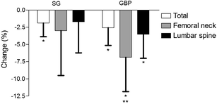 Excess weight loss (mean ± SE), adjusted by baseline excess weight, was 79.1±3.8 % and 74.9 ± 4.1 % 1 year after GBP and SG, respectively (p = 0.481). Significant reduction in BMD for total body (TB), lumbar spine (LS), and femoral neck (FN) was observed after GBP. In the SG group, reduction in BMD was significant only for TB. Adjusted by baseline BMD, the difference between change in BMD for GBP vs. SG was not significant for TB, LS, or FN. Percent reduction in ghrelin concentration was a main factor related to total BMD loss (GBP group) and LS BMD loss (GBP and SG groups).
