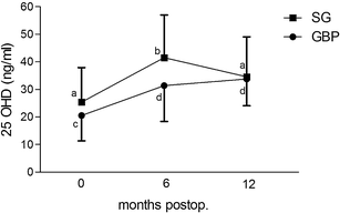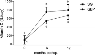 Twenty-three women undergoing GBP (BMI 42.0 ± 4.2 kg/m2; 37.3 ± 8.1 years) and 20 undergoing SG (BMI 37.3 ± 3.2 kg/m2; 34.2 ± 10.2 years) were studied before and 6 and 12 months after surgery. BMD was measured by dual-energy X-ray absorptiometry. Plasma PTH, 25-hydroxyvitamin D (25-OHD), ghrelin, and adiponectin concentrations were determined. Food as well as calcium and vitamin D supplement intake was recorded.