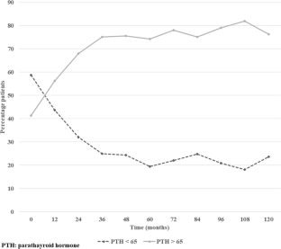 In total, 321 patients were included (76.6% women), with mean age 43.0 (10.5) years. Median follow-up was 6.0 (IQR 3.0–9.0) years. Mean body mass index was 49.8 (7.0) kg/m2. SHPT increased to a maximum of 81.9% in the ninth year of follow-up (95% CI: 1.5–9.1). Two years after surgery, 33.9% of patients with 25(OH)D sufficiency had SHPT (p = 0.001). Corrected calcium levels were lower in patients with PTH > 65 pg/mL when compared with PTH < 65 pg/mL; 1 year: 8.96 vs 9.1 mg/dL and 5 years: 8.75 vs 9.12 mg/dL (p < 0.01). After surgery, patients with PTH > 65 pg/mL and 25(OH)D sufficiency had lower corrected calcium levels when compared with subjects with PTH and 25(OH)D in normal range. Two years: 9.0 vs 9.2 mg/dL (p < 0.05) and 4 years: 8.9 vs 9.2 mg/dL (p < 0.01).